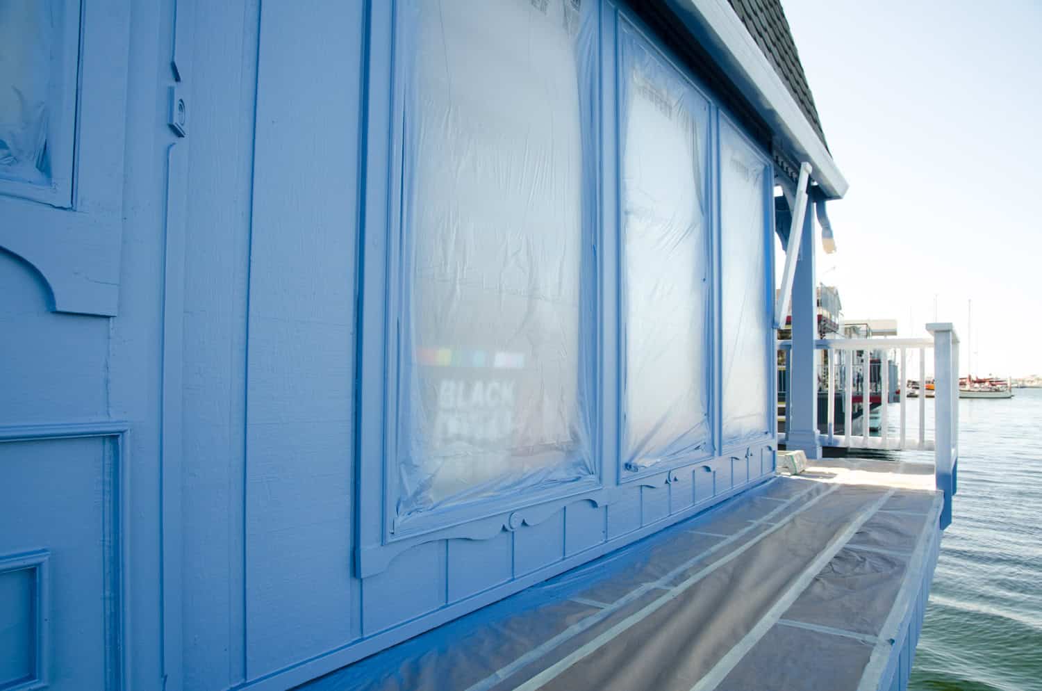 When painting this lovely home, our team, featuring Julio and Raymondo, had to very quickly adjust to balancing on ladders on floating docks and barges, which float alongside and independently of the home — that is also floating.