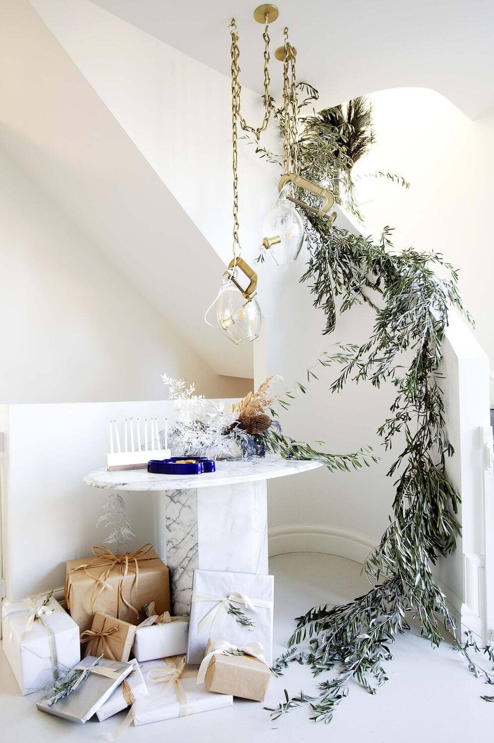 Keep it minimalist and contemporary. “Many Hanukkah traditions revolve around oil to represent the miracle of light, so we made a garland out of olive branches in homage to that. Pair a contemporary menorah and minimalist gift wrap for a new spin on the season.” -Gillian Segal, Vancouver