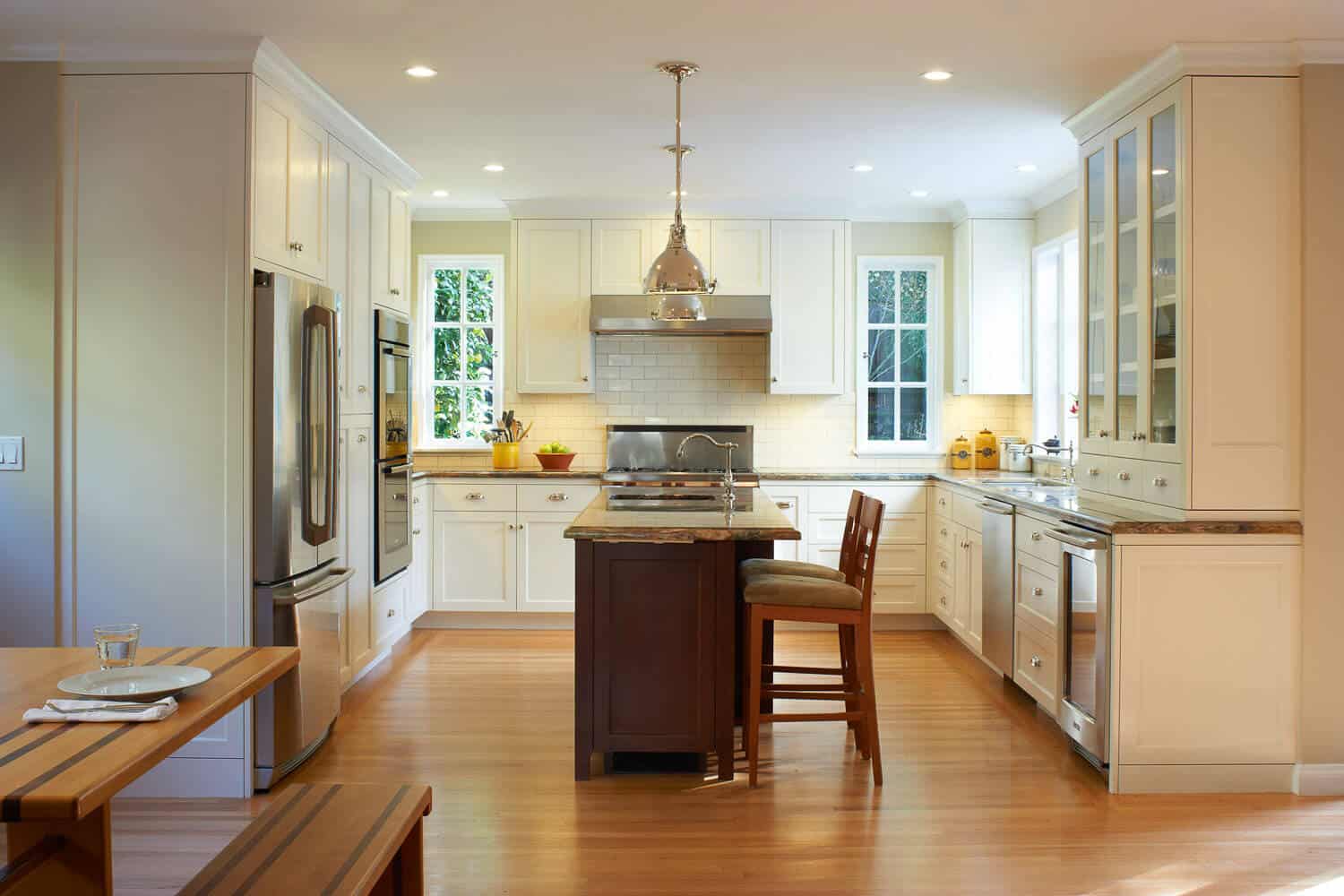 Heavy, bulky pendant lighting had a moment, but the industrial style had come and gone in favor of something a little lighter and more understated. The new method lets the rest of the kitchen shine and doesn’t block the view in the open concept room.